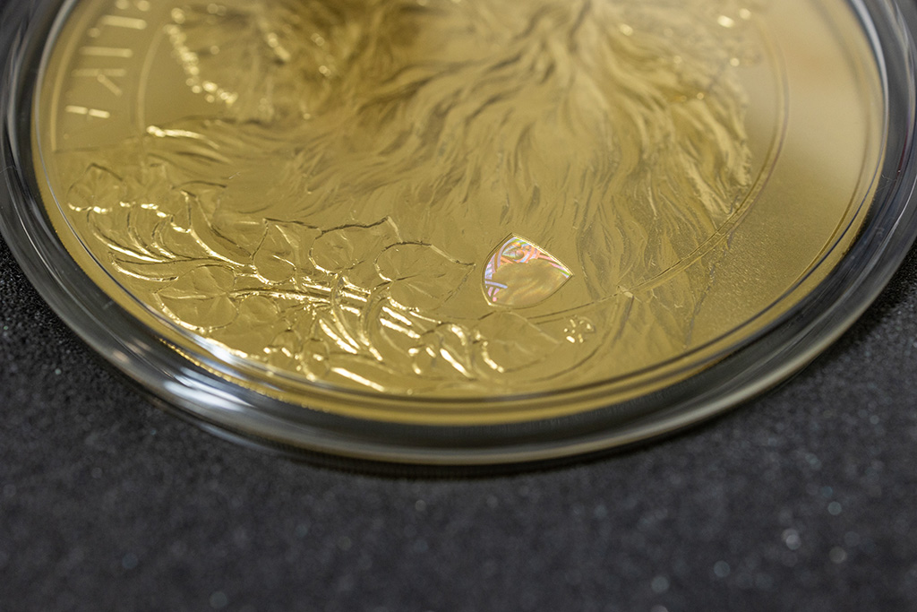 The giant Bohemian Lion is impressive not only for its weight but also for another primacy. "It contains the newest security feature, an embossed shield-shaped hologram placed at the bottom of the reverse side of the coin. This hologram is not only a protective element, but also an ornamental one," said Lenka Klimentová, the Mint's spokesperson, pointing out another unique feature, adding that this solution was named after the English pun CZECH SECURITY CHECK.