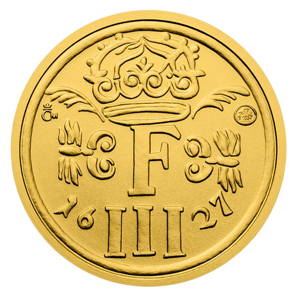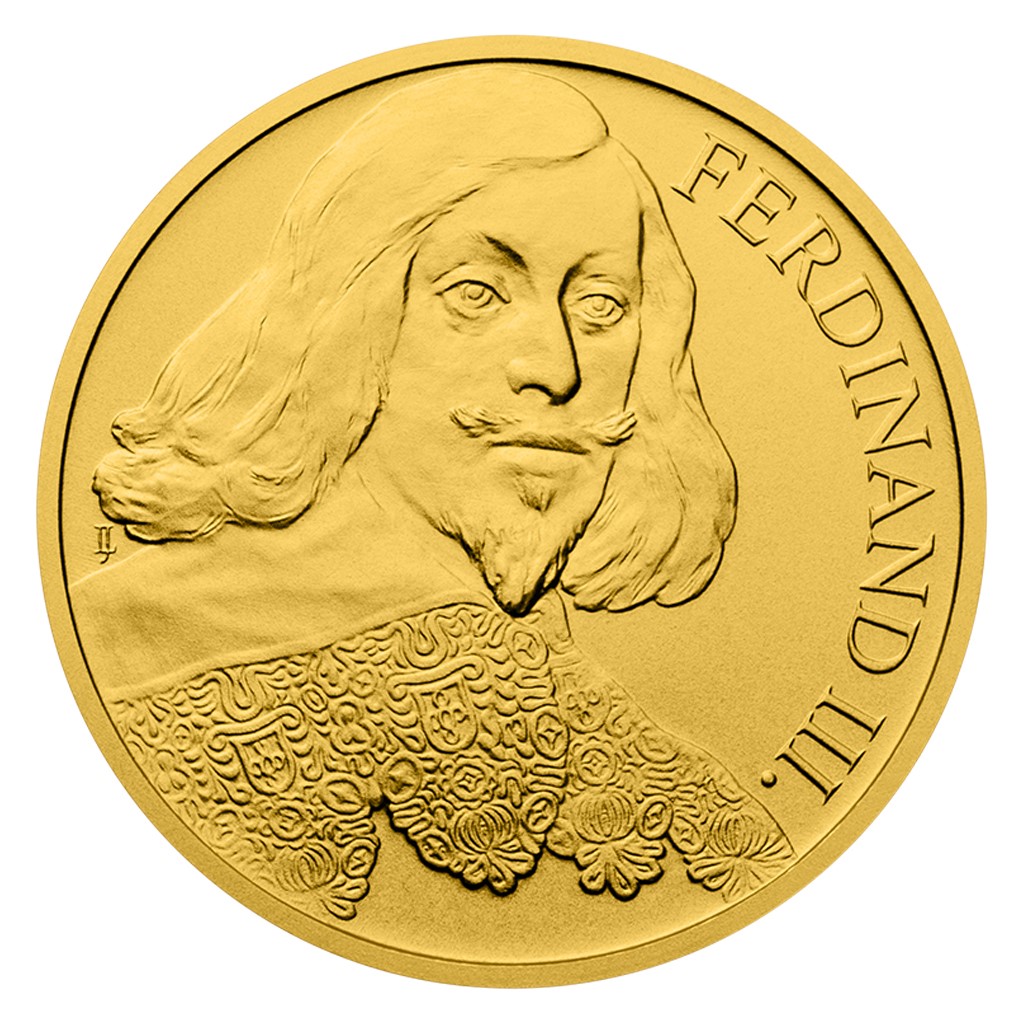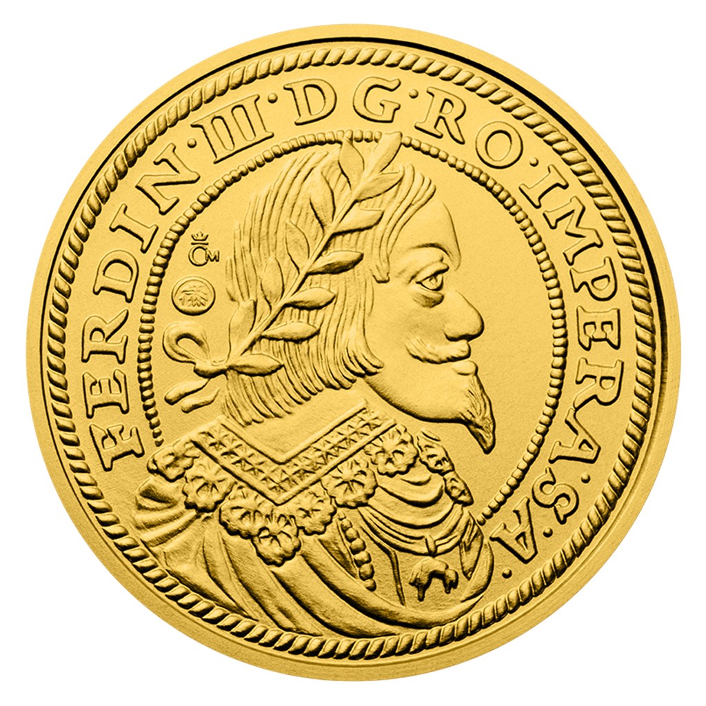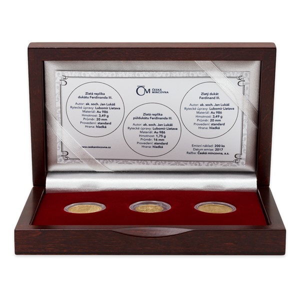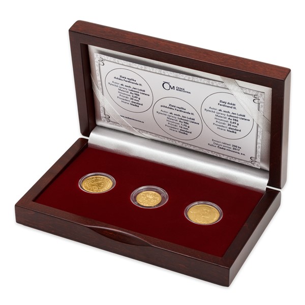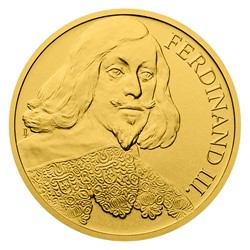 Jubilee set dedicated to Ferdinand III. presents three gold mintages, all of them made by the leading academic sculptor Jan Lukas. The first one is a modern ducat whose motif is the crowning of the Habsburg by the Czech king. The obverse side bears the monarch's portrait, while the reverse side bears the St. Wenceslas crown. The second mintage also commemorates the Czech coronation, but it is a replica of the historical half-ducat from 1627. The third mintage is the replica of the ducat of Ferdinand III. from 1648.