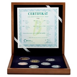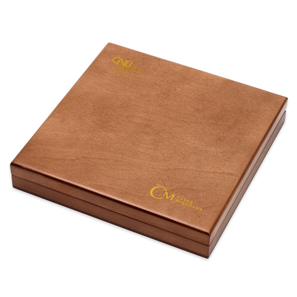 The commemorative set is stored in an elegant wooden etui, part of which is a numbered certificate of authenticity from the State Printing Works of Securities.