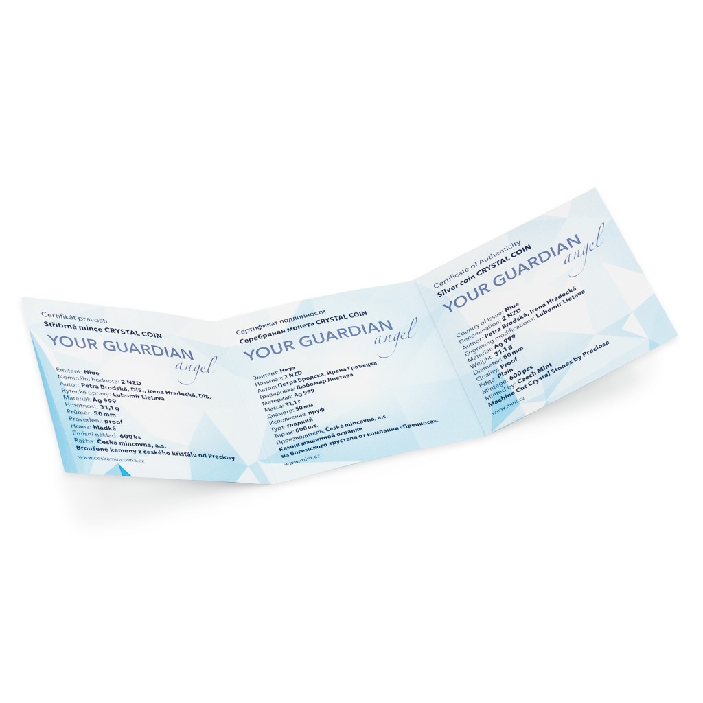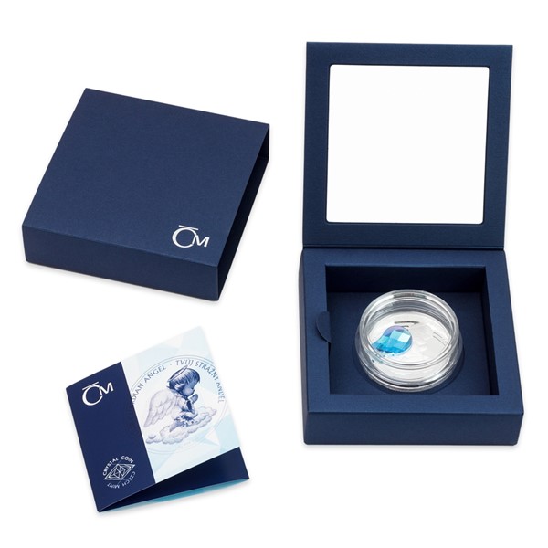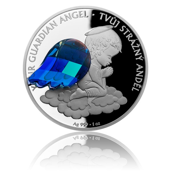 Unique silver coins with Czech cut crystal from the cycle “Crystal Coin“ are the result of a unparalleled combination of a traditional Jablonec crafts, which are coming of the Czech Mint and glasswork of Preciosa. The motif of the guardian angel comes after the gift coins, the theme of which was birthday, happiness, love and enjoyment of life.