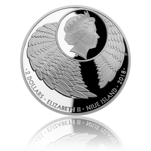 Expert female medal makers Irena Hradecká, DiS., and Petra Brodská, DiS., from the Czech Mint attributed to the guardian angel cute form of the winged baby with the halo, who kneels in the clouds and prays for us prayerfully. The silver relief is followed by a cut crystal in the shape of a wing. The Czech-English inscription "YOUR GUARDIAN ANGEL – TVŮJ STRÁŽNÝ ANDĚL" completes the composition of the reverse side. Since the coin of the Czech Mint is licensed by a foreign issuer, which is the island of Niue, the obverse side of the coin bears its necessary attributes, which are the nominal value of 2 DOLLARS (NZD), the year of the issue 2018, the name Elizabeth II. and portrait of a ruler surrounded by angel wings.