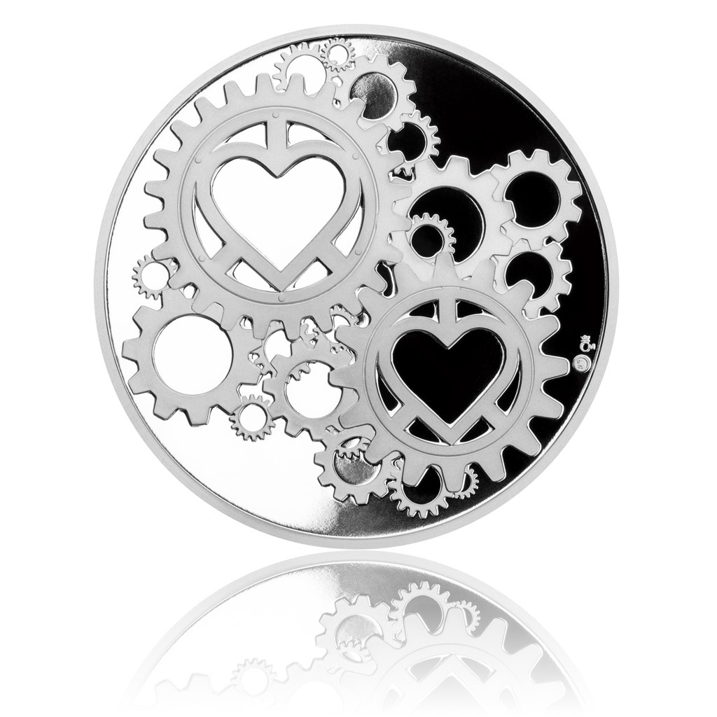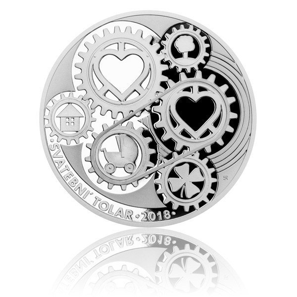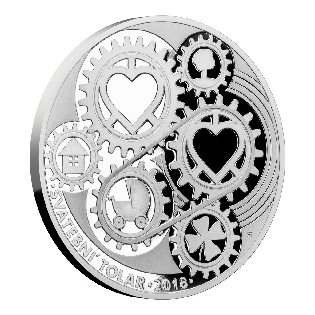 That is the idea of a talented medal maker Roman Shamilyan, who has prepared a new form of wedding thaler for 2018. The gears dominate both the obverse and the reverse side of the medal. In their middle there are symbols of love and happiness in the form of hearts and four leaf clover. Other pictograms of the house, tree and pram go back to the old saying, "Build a house, plant a tree and father a son." The obverse side is complemented by the inscription WEDDING THALER 2018.