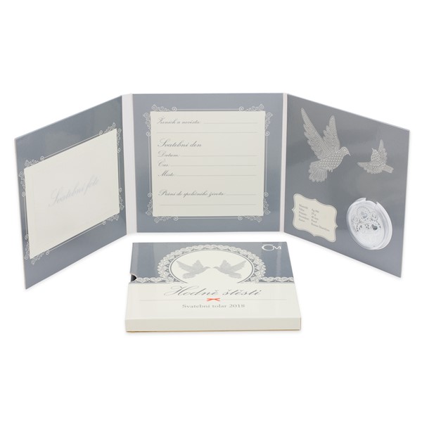 Each thaler includes a gift packaging that is in the form of a folding bookcase with a wrapper. It includes space for inscribing wedding day data and wedding photography.