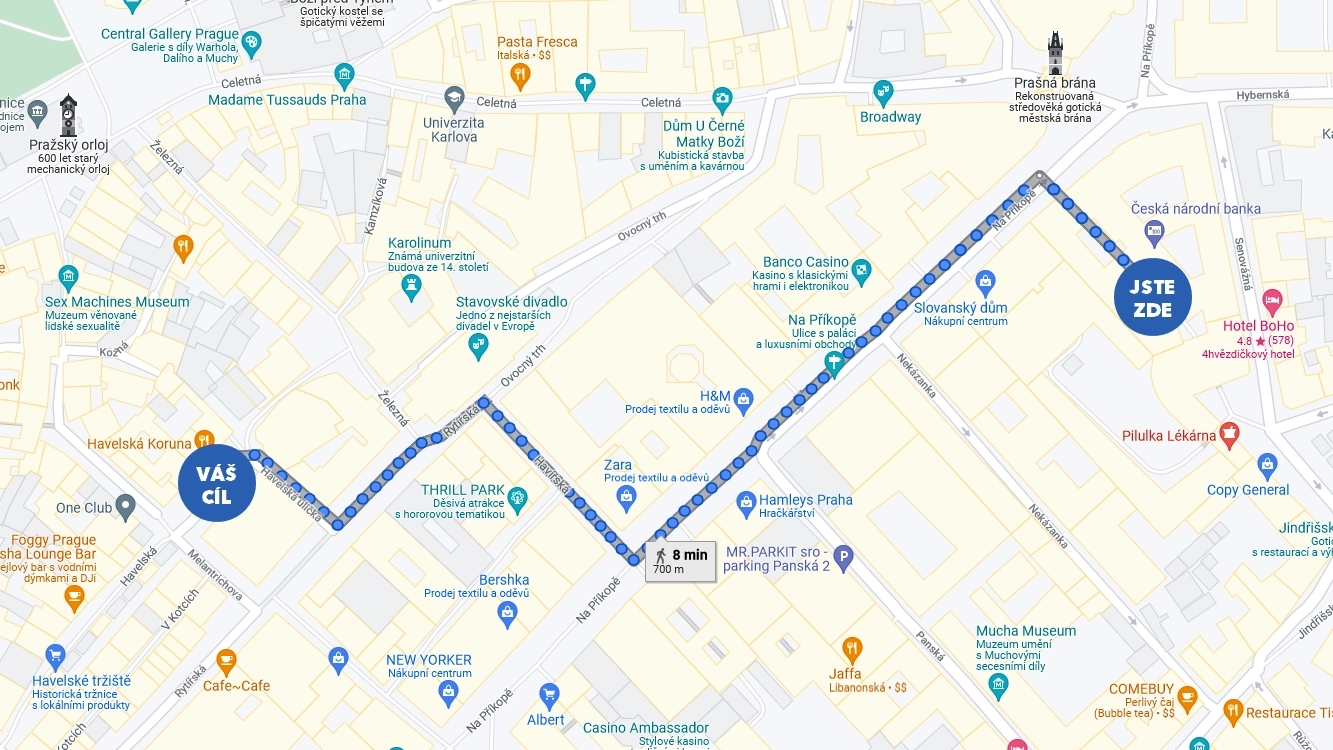 Rádi vás obsloužíme v naší druhé pražské prodejně, kterou najdete v Havelské ulici. Vzdálenost 700 metrů, která je vyznačena v mapě, urazíte pěšky přibližně za 8 minut:
