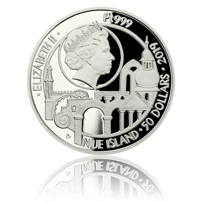Averzní straně poté vévodí koláž složená z architektonických prvků českých staveb patřících na seznam UNESCO. Dále nese atributy ostrova Niue, který České mincovně poskytuje zahraniční licenci pro vydávání pamětních mincí. Jsou jimi jméno a portrét panovnice Alžběty II., letopočet emise 2019 a nominální hodnota 50 DOLLARS.
